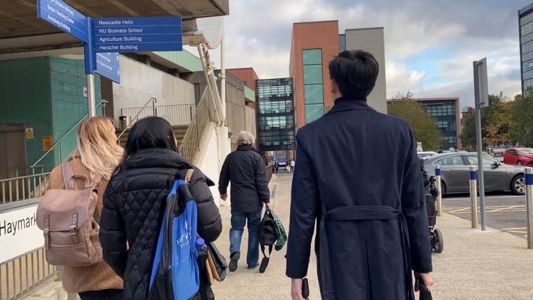 ข้างหน้าคืออาคาร INTO Newcastle University และถ้าเลี้ยวซ้ายที่แยกจะเป็น Haymarket Metro Station